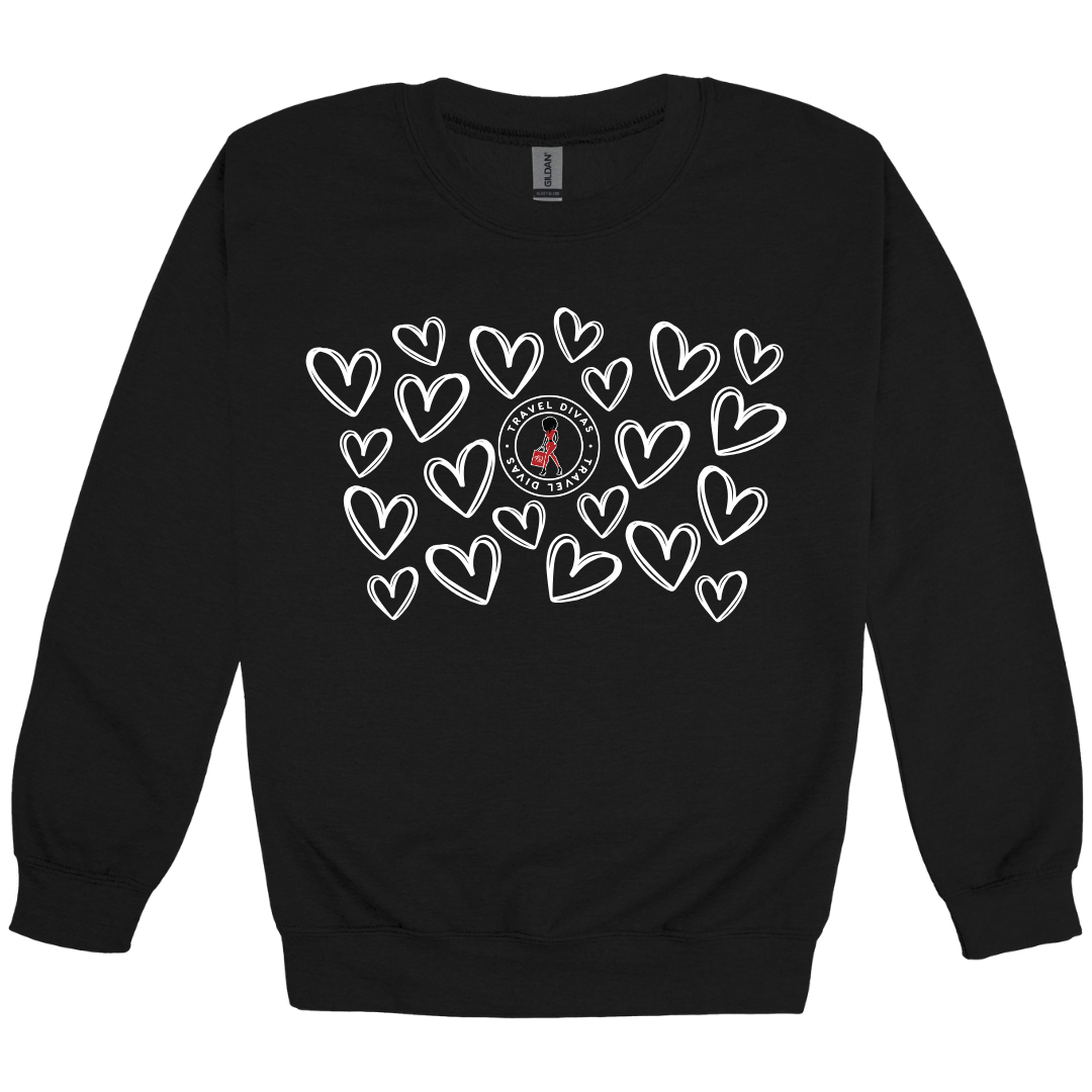 Wear your heart (and your favorite travel community) on your sleeve. This Scattered Hearts sweatshirt features a cluster of chic, hand-drawn hearts centered around the iconic Travel Divas logo. It’s a subtle yet stylish nod to the love we share for exploration and sisterhood. Made for comfort and designed for impact, it’s the perfect piece to layer under a jacket while you're chasing sunsets across the globe.